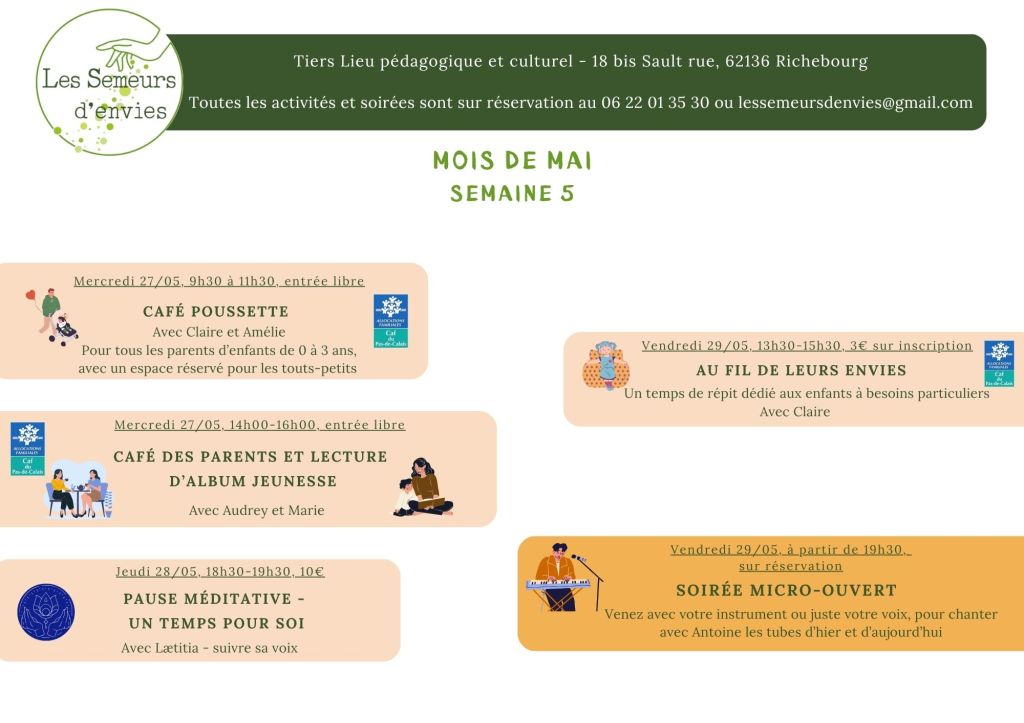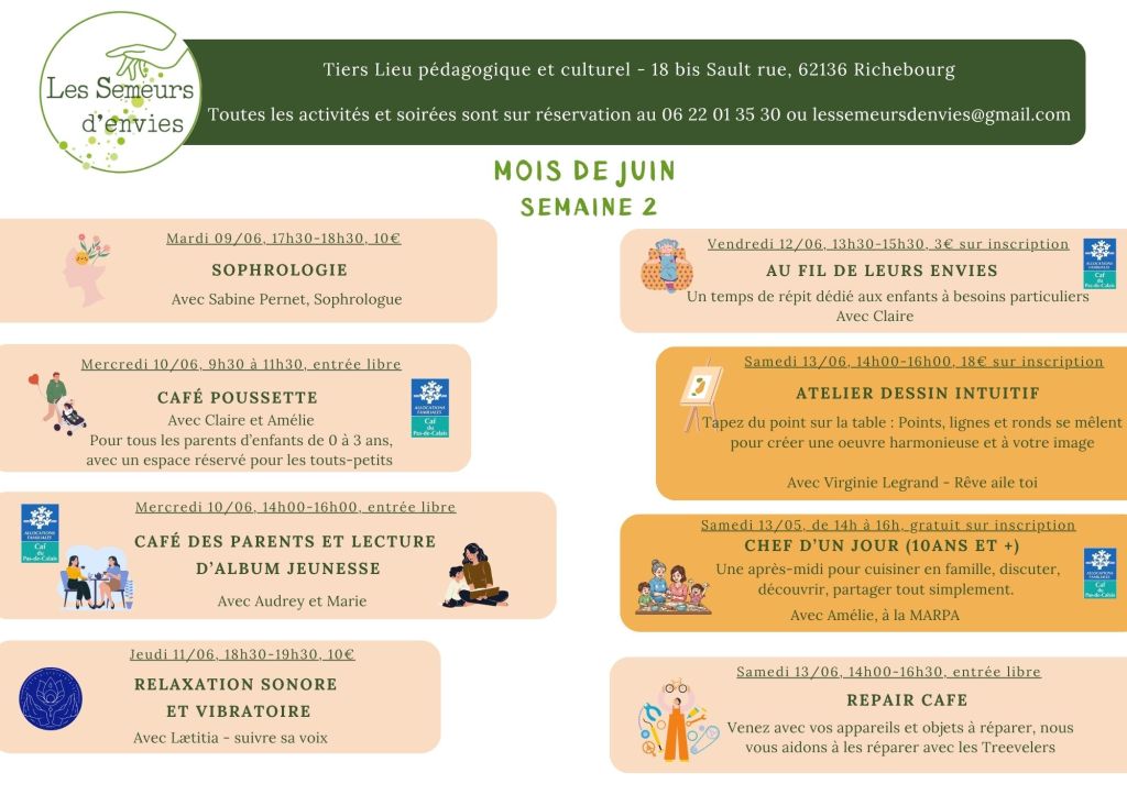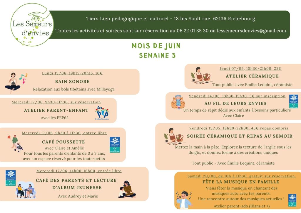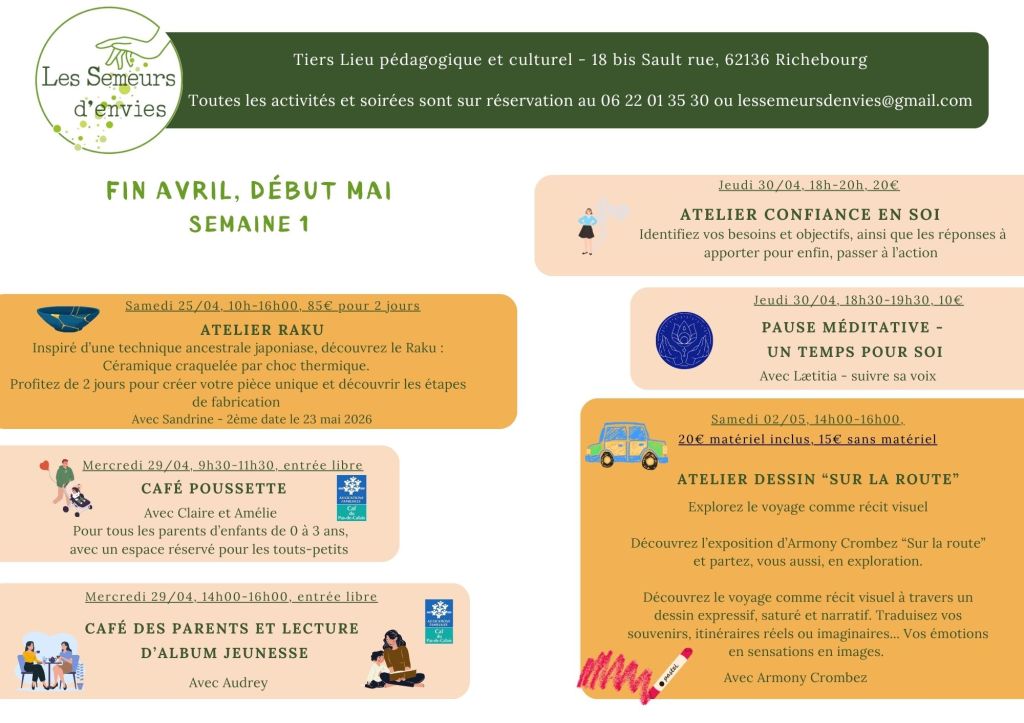 renseignements et réservation pour activités gratuites 06 22 01 35 30, Billetterie pour activités payantes sur le site helloasso : https://www.helloasso.com/associations/les-semeurs-d-envies