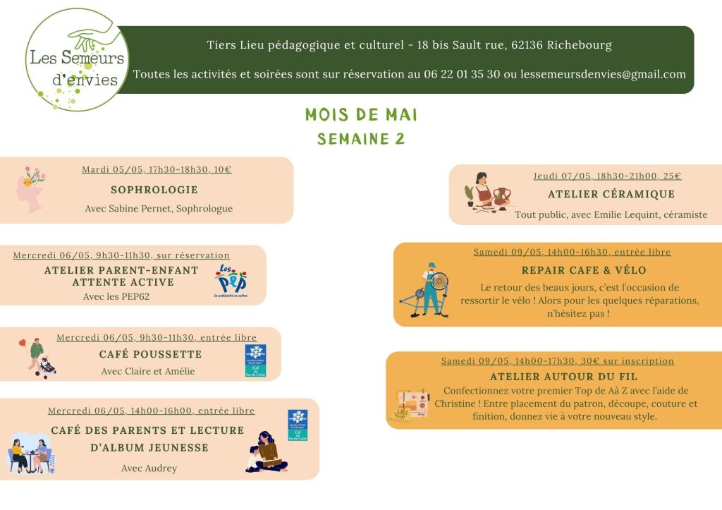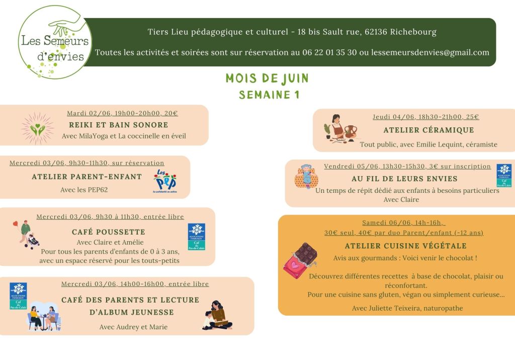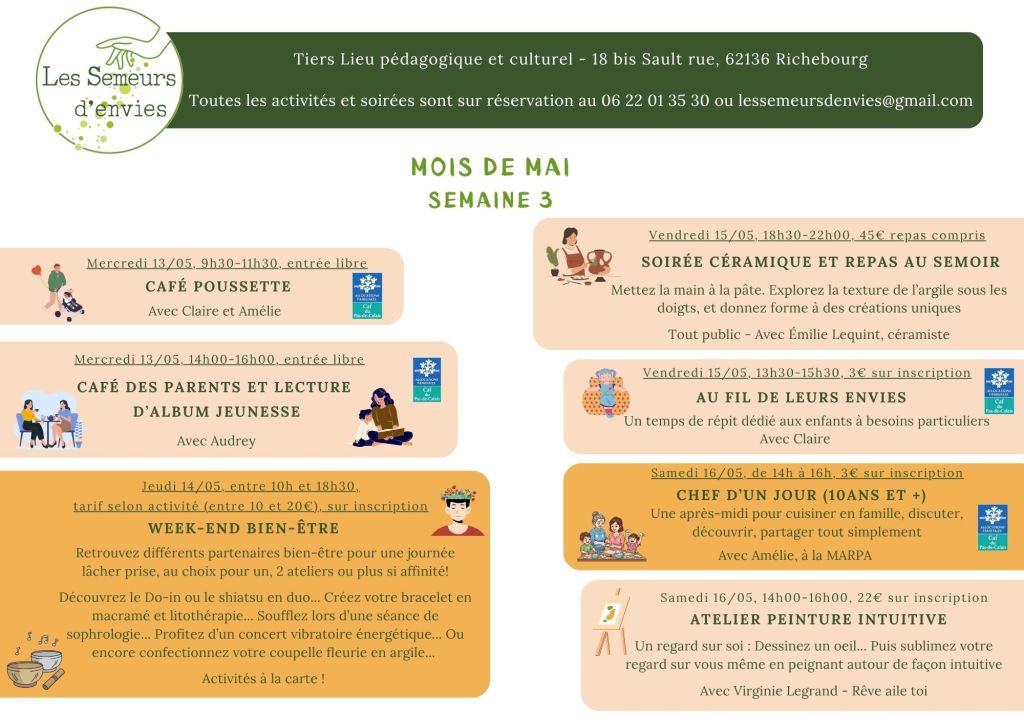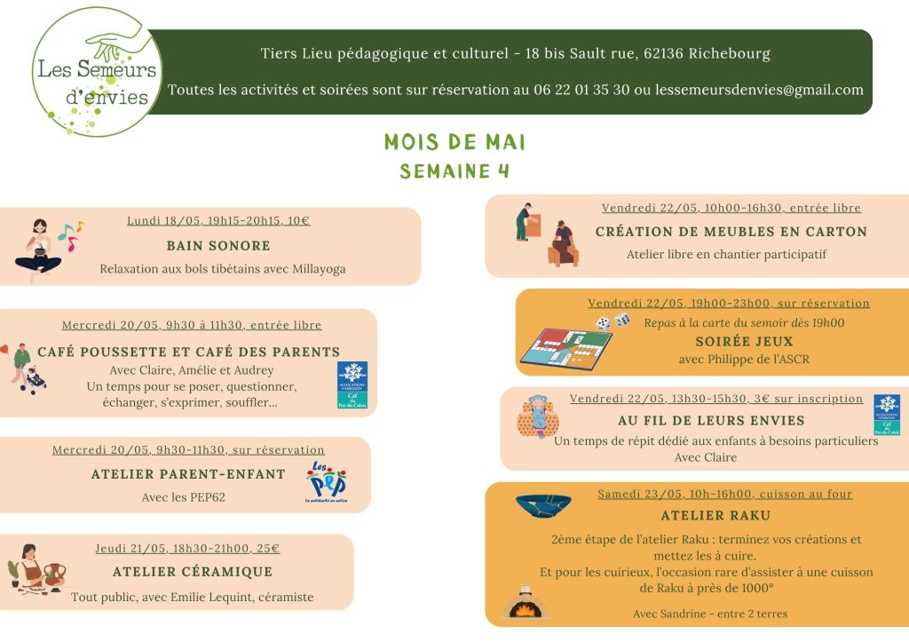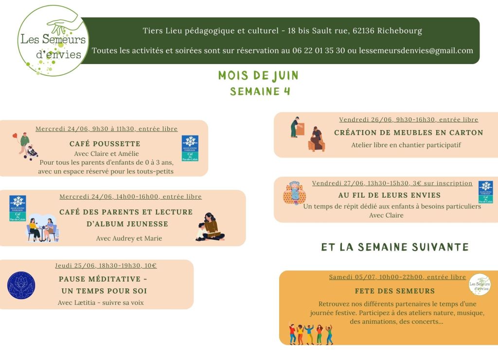 renseignements et réservation pour activités gratuites 06 22 01 35 30, Billetterie pour activités payantes sur le site helloasso : https://www.helloasso.com/associations/les-semeurs-d-envies