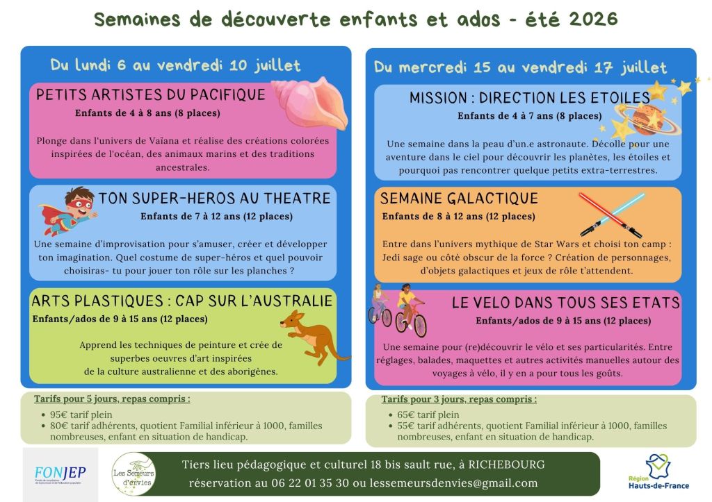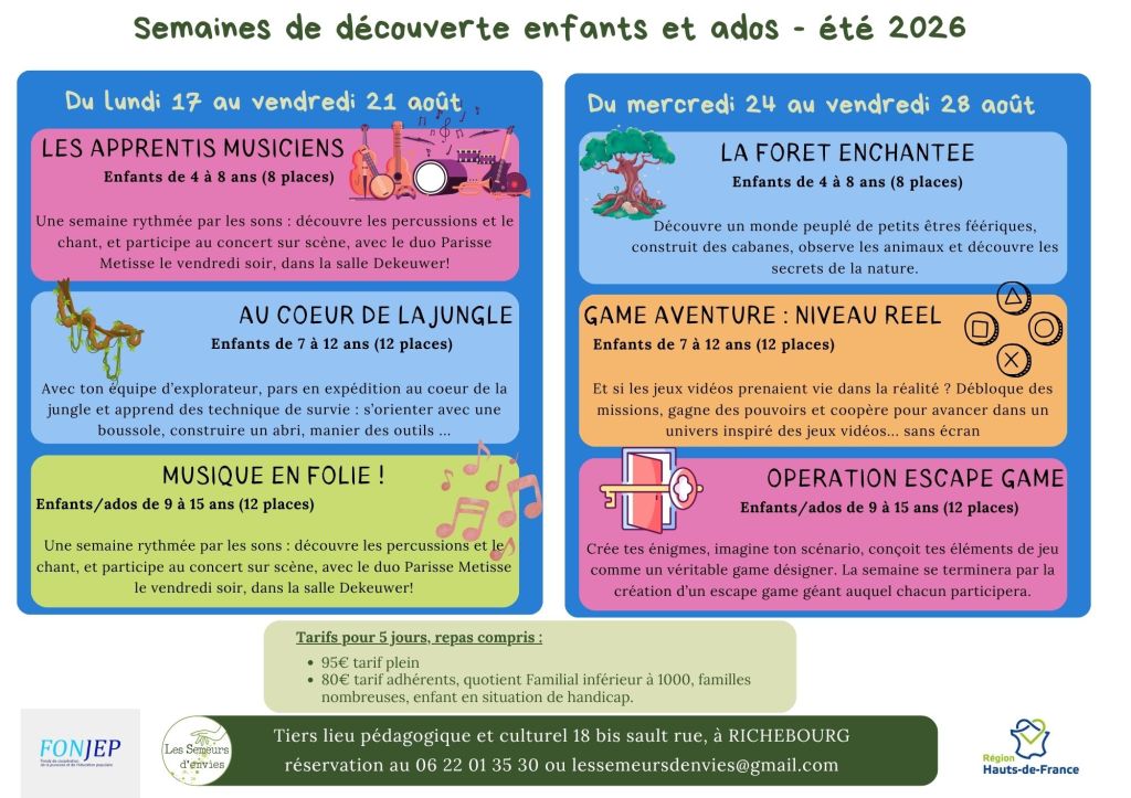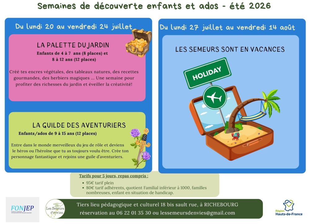 Renseignements et réservation pour activités gratuites 06 22 01 35 30, Billetterie pour activités payantes sur le site helloasso : https://www.helloasso.com/associations/les-semeurs-d-envies